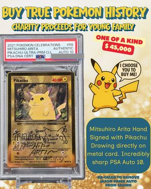 ThePokeCard.com lists a one-of-a-kind gold-plated Pikachu card, signed and illustrated by Mitsuhiro Arita, to benefit a family facing Parkinson’s Plus.